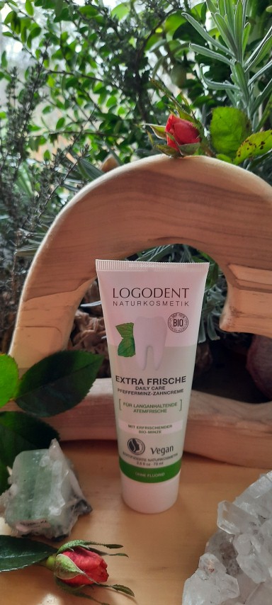 Die LOGODENT EXTRA FRISCHE Zahncreme mit erfrischender Bio-Minze ist ideal für die tägliche Anwendung geeignet und sorgt für eine langanhaltende Atemfrische.