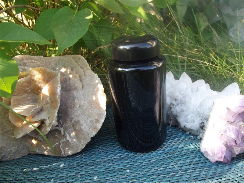 Violettglas (Mironglas) bietet einen absoluten Lichtschutz im sichtbaren Bereich, ist im Violett- und Ultraviolettbereich durchlässig und läßt dadurch ein einzigartiges, hoch-energetisches Milieu im Innern entstehen. Die Molekularstruktur von darin eingef
